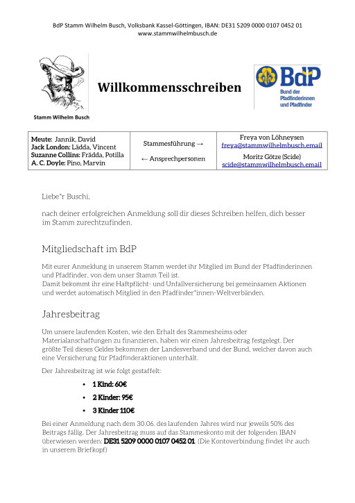 Hier könnt ihr ein paar Dokumente als PDFs herunterladen. Willkommensschreiben Stammes-Anmeldung (zum Ausfüllen) Fotoerlaubnis (zum Ausfüllen) Jahreskalender 2025 Jahreskalender 2025 (Tabelle)